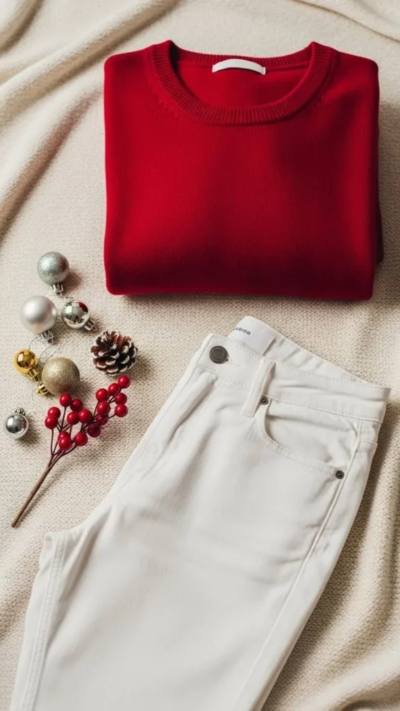 A red jumper and white jeans create an instant holiday outfit. The colours work well for daytime plans and casual gatherings. Add a small DIY bow pin or tiny pom-poms to the jumper if you want extra detail. Wear trainers for a relaxed feel or boots for evening plans. Carry a neutral or metallic bag. It’s warm, cheerful, and perfect for quick dressing.