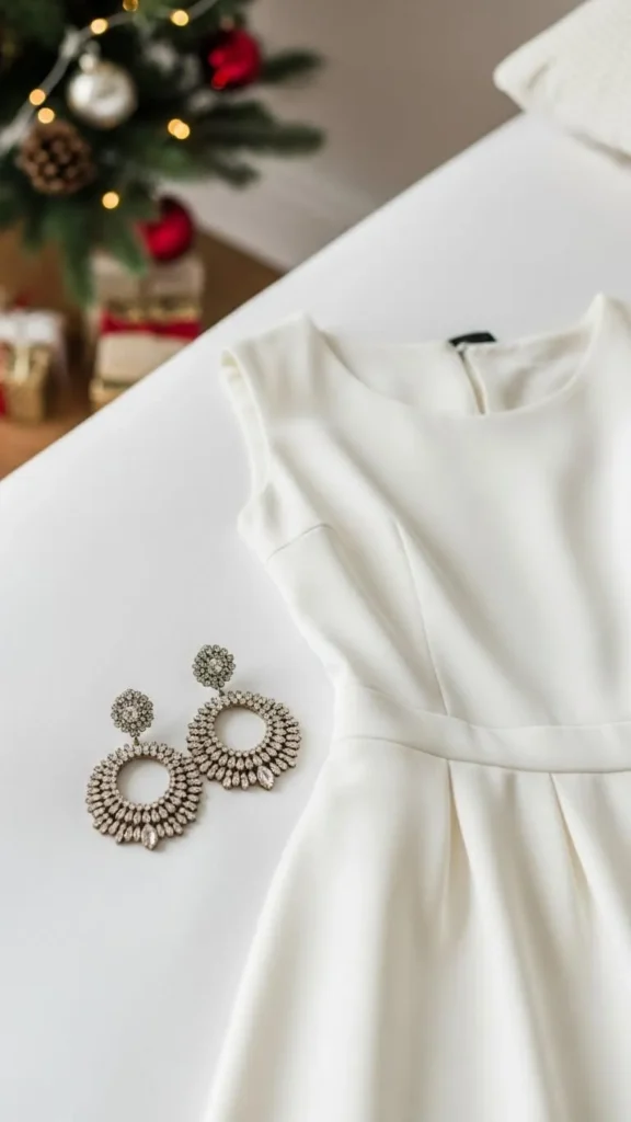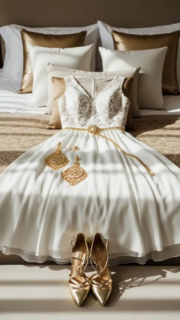 A white dress looks festive when paired with gold accessories. Add gold earrings, a belt, or heels. Glue small gold beads near the neckline if you want a quick DIY detail. Works for dinners and more formal events.
