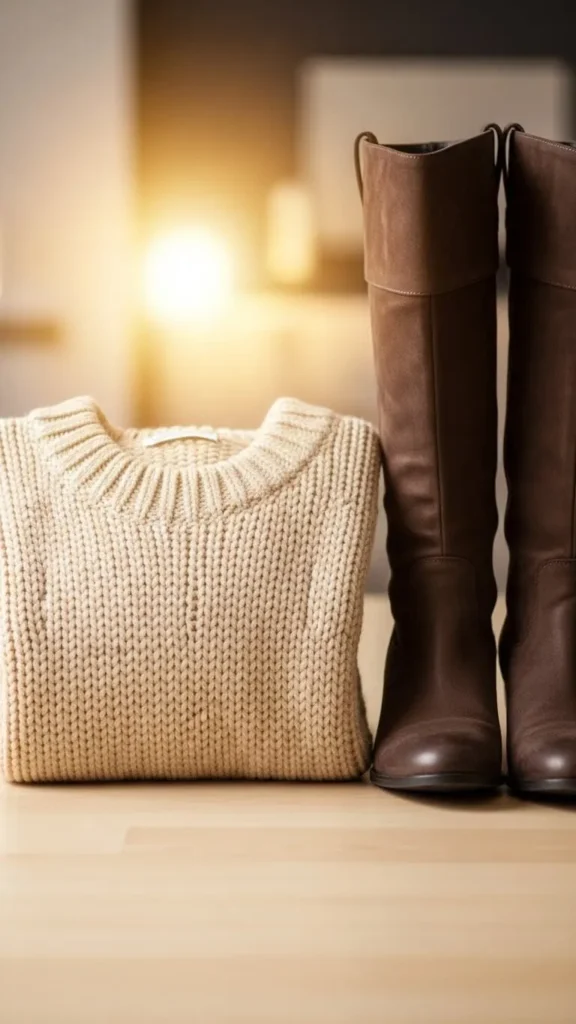 A sweater dress paired with knee-high boots is an easy, warm choice. Choose tan, grey, or cream tones. Add a belt if you want more shape. Wear a long coat if going outside. Works well for family gatherings or simple evening plans.
