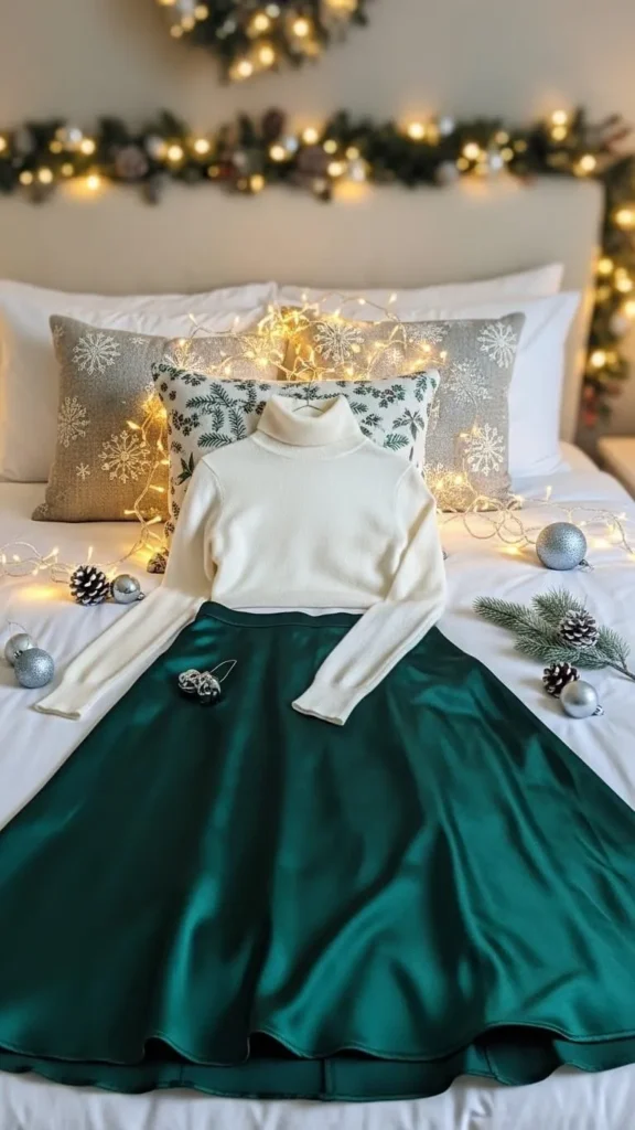 A satin skirt paired with a turtleneck gives you a soft, dressed look with almost no effort. Pick a neutral turtleneck and tuck the front slightly. Add a ribbon as a temporary belt if you want shape. Flats or ankle boots both work well. This outfit suits dinners, church events, or photos. A long coat works nicely if it’s cold. It’s minimal but still feels festive.