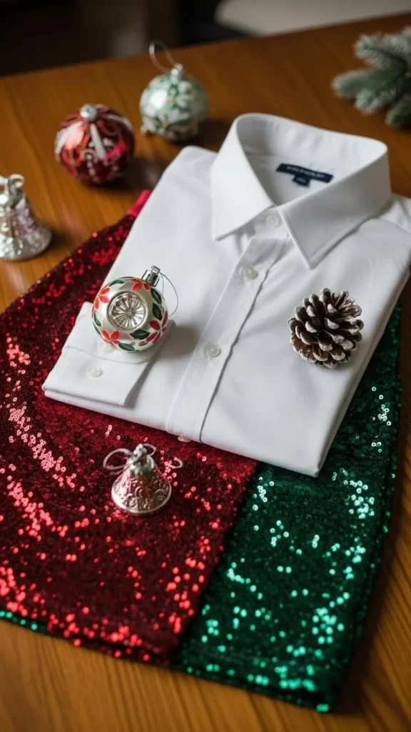 A white shirt pairs well with any festive skirt—sequins, velvet, tartan, or metallics. Tuck it fully and roll the sleeves slightly. Add a thin ribbon at the collar for detail. Boots or heels both work. This outfit suits office gatherings, dinners, and smart-casual parties.