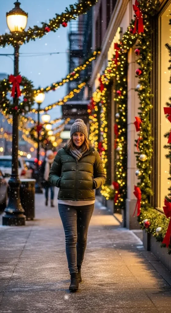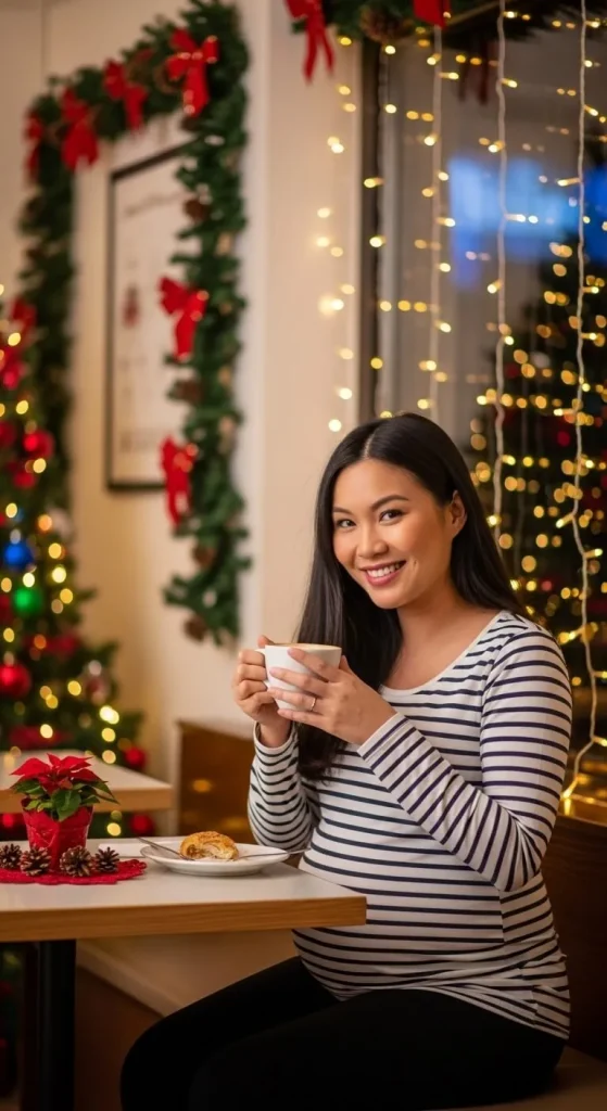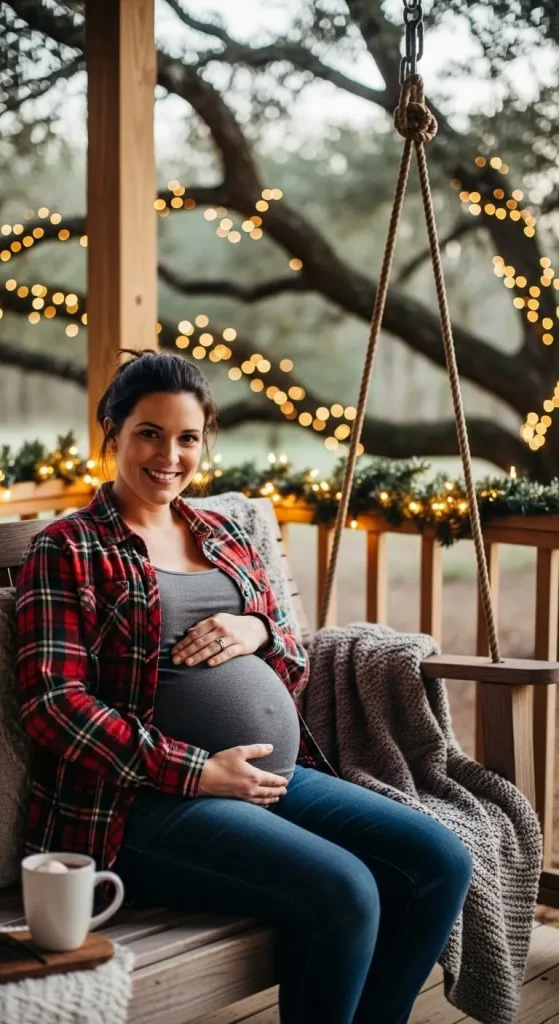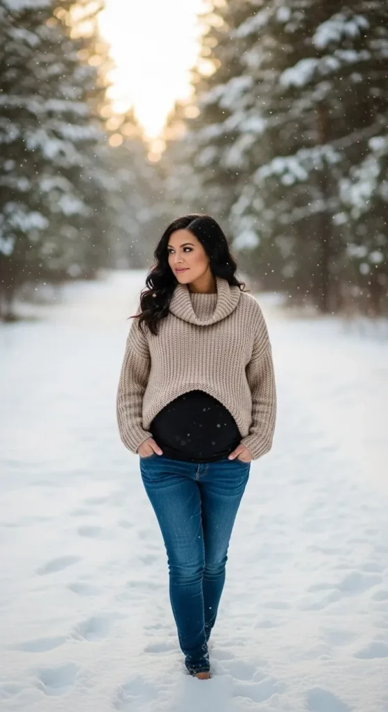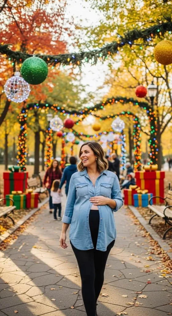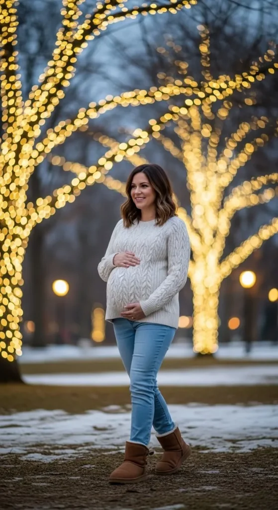 Stay warm and stylish with a puffer jacket and skinny jeans. The jacket will keep you cozy during colder days, and the jeans provide a flattering fit that hugs your curves. Opt for a puffer jacket that’s designed for maternity wear to ensure it fits comfortably around your belly. Pair with a soft sweater underneath for extra warmth. This look is perfect for a holiday stroll through the neighborhood or running errands during the festive season.