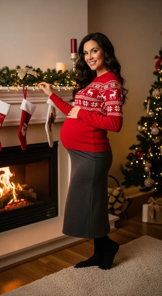 For a super casual yet stylish holiday look, a maternity sweatshirt paired with joggers is an ideal combination. Choose a sweatshirt with a fun holiday graphic or a simple, comfortable design that will keep you feeling relaxed. Joggers are perfect for expecting moms because they provide stretch and flexibility around the waist and hips. Pair this outfit with fuzzy slippers for an even cozier vibe. This look is perfect for staying in, whether you’re watching Christmas movies or enjoying a warm beverage by the fire.