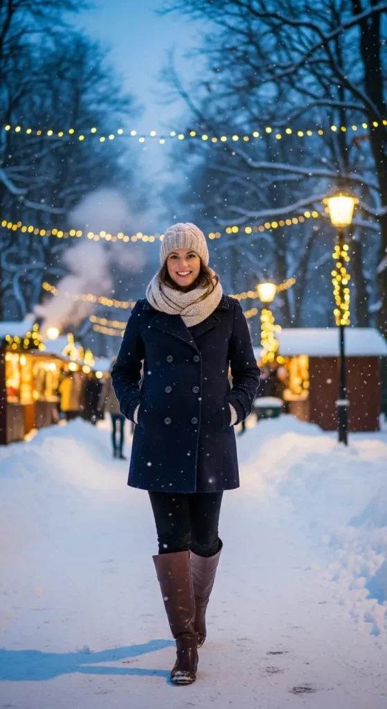 A maternity peacoat paired with leggings is both practical and stylish for the winter holidays. The peacoat’s structured design will help you stay warm while offering a flattering silhouette. Pair it with black leggings for a more relaxed fit, and opt for knee-high boots to keep your legs warm. This outfit is perfect for outdoor activities like holiday shopping or a festive walk in the park.