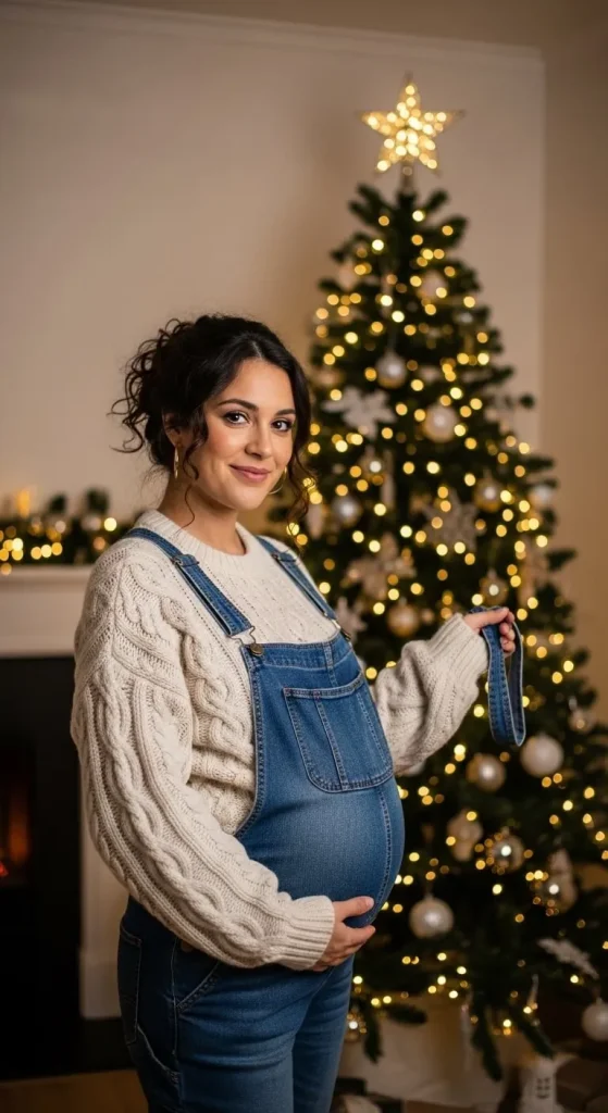 Maternity overalls offer a playful yet functional holiday outfit. Layer them over a cozy sweater for extra warmth and style. Overalls provide a relaxed fit that accommodates your growing belly while still looking chic. Pair with comfortable sneakers or ankle boots, and add a scarf to keep warm during outdoor activities. This look is perfect for casual holiday activities like shopping or decorating the house.