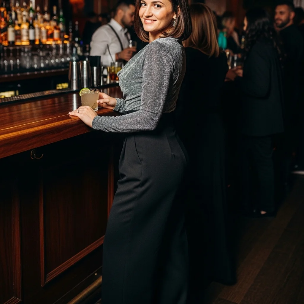 For a sleek and classy outfit, wear black wide-leg trousers with a sparkly top. Add a bold lip for colour. The look is elegant yet easy to move in. It’s also a great option when you want comfort without losing the festive vibe.