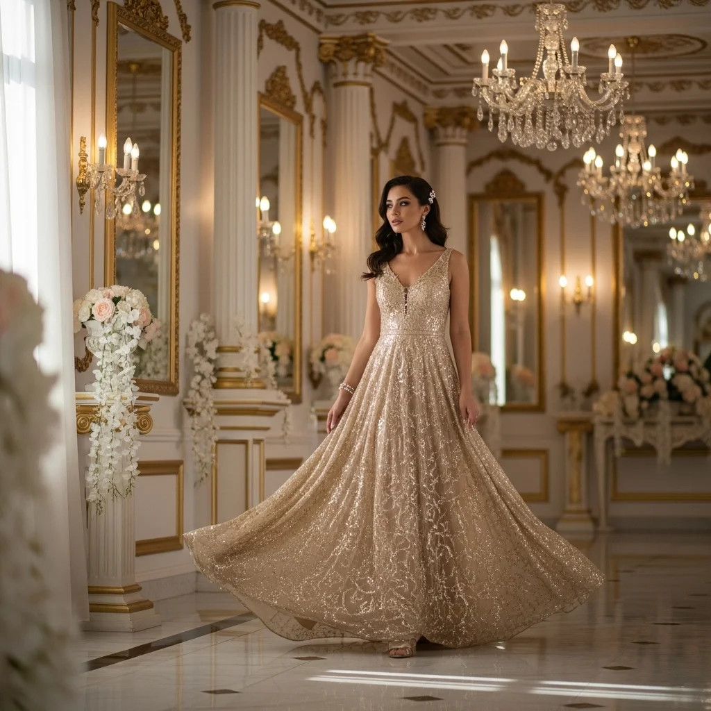 A gold maxi dress makes a statement at any holiday party. Keep accessories minimal—let the dress do the work. Pair with nude heels and simple stud earrings. Gold tones look best under warm light, perfect for evening celebrations.