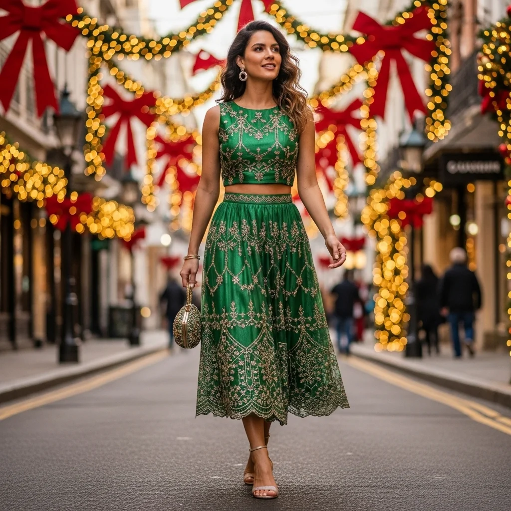 Mixing casual and festive always works. Pair a sequin skirt with your favourite graphic tee. Tuck it in and finish with sneakers or block heels. This combo is perfect for friends’ gatherings. DIY idea: glue or sew sequins onto an old skirt.