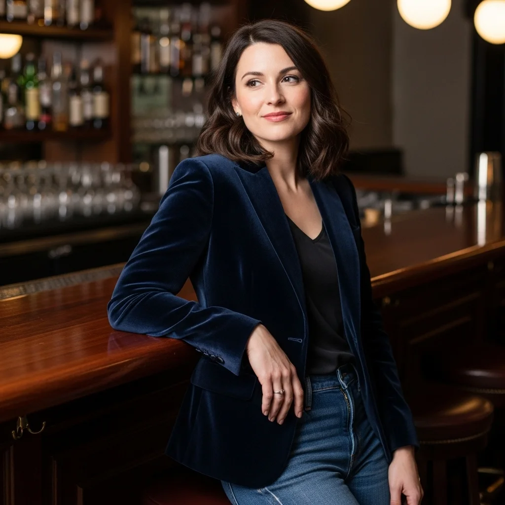 A velvet blazer makes casual outfits look festive. Pair with dark jeans and a camisole. It’s an easy way to dress up without feeling overdressed. Add heeled loafers or booties to complete the look.
