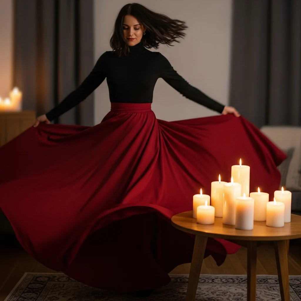 Pairing a maxi skirt with a turtleneck creates flow and comfort. Add a thin belt or a chunky necklace to finish it off. Reuse old maxi skirts by layering them with winter textures for a holiday twist.