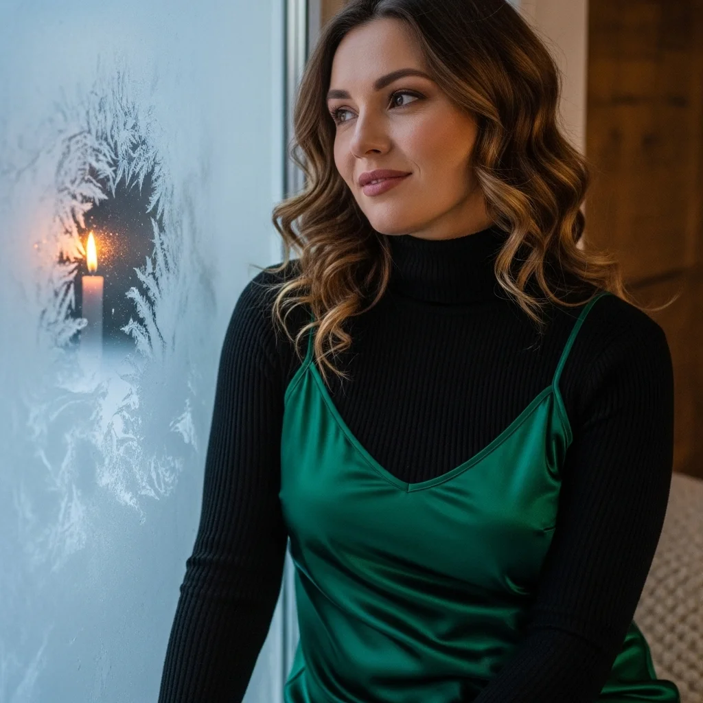 Layer your satin slip dress over a fitted turtleneck for an instant cozy upgrade. Finish with boots and dainty earrings. This combo works beautifully for chilly nights. Try reusing an old summer dress—it’s an affordable way to make it winter-appropriate.
