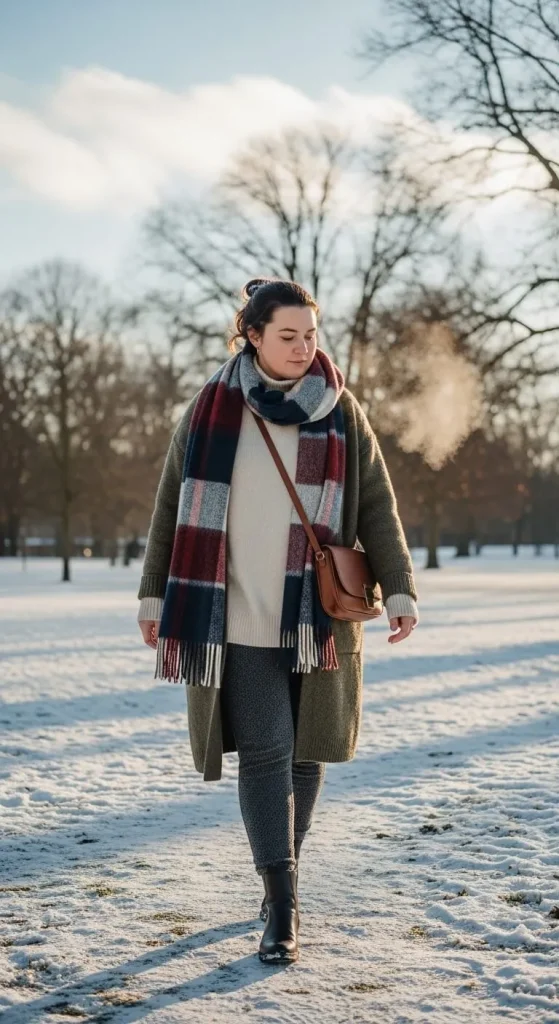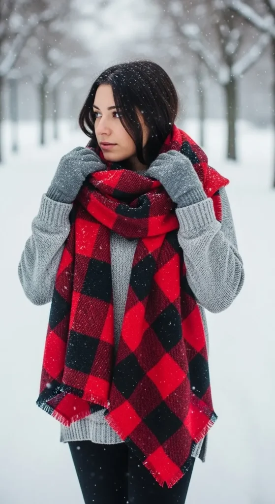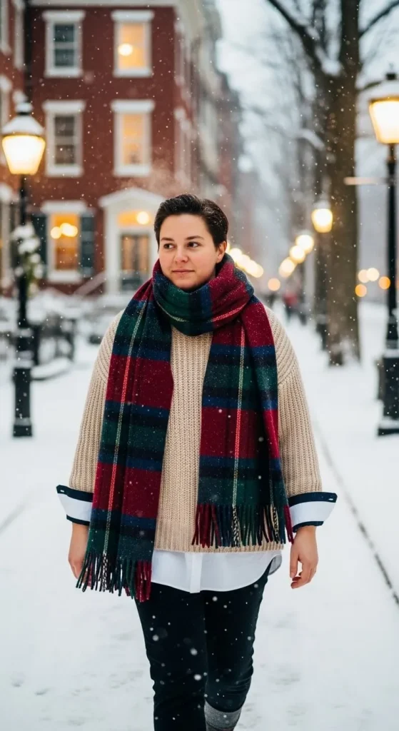 For a cozy yet chic look, layer a plaid blanket scarf over a simple sweater. The blanket scarf adds warmth and texture while making a bold statement. It’s a simple way to elevate any sweater and make it perfect for cold weather. If you’re on a budget, buy a cheap scarf from a local market and repurpose an old sweater you have at home.