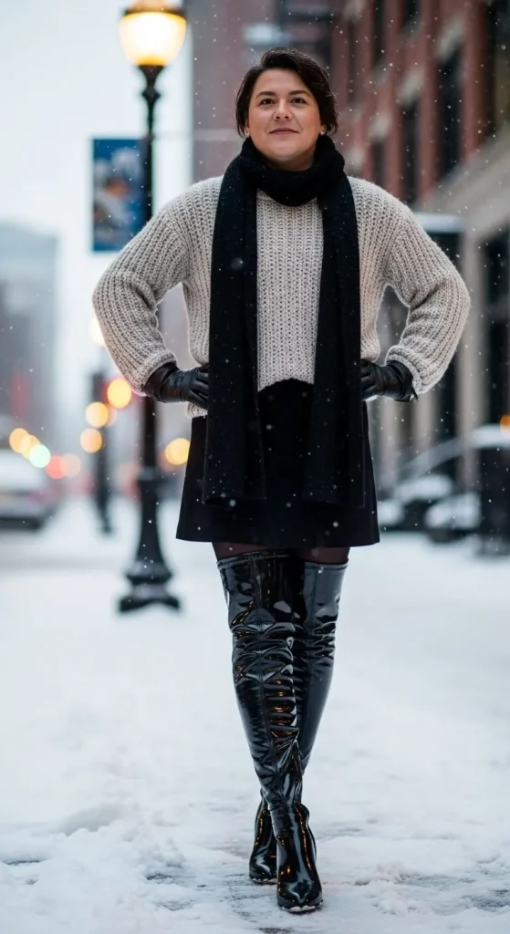 A sweater paired with a mini skirt and over-the-knee boots offers a chic, layered look. The sweater provides warmth while the mini skirt keeps things fun and stylish. Over-the-knee boots add both comfort and fashion. If you’re on a budget, consider thrifted sweaters and secondhand skirts to achieve this look without breaking the bank.