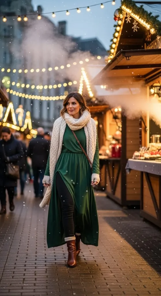 For an unexpected holiday look, layer a maxi dress over thick leggings. The flowy nature of the dress offers a relaxed, yet elegant feel, while the leggings provide warmth and comfort. Add a cozy cardigan or denim jacket for additional warmth. This combination is perfect for a casual holiday brunch or a family get-together. If you’re looking to save money, swap the maxi dress for a long, cozy sweater dress for a similar effect.