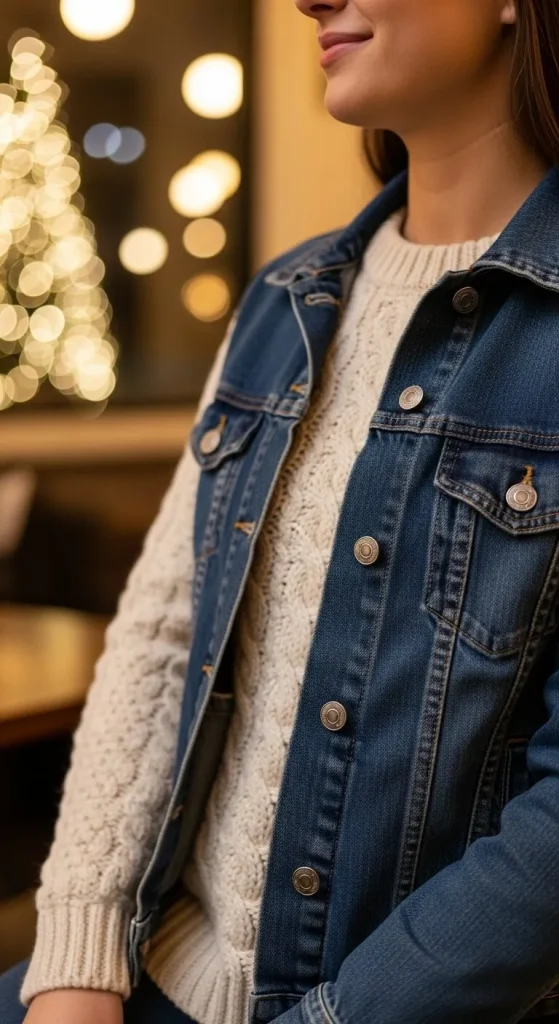Pair a wool sweater with a denim jacket for a timeless, casual layering look. The wool sweater provides warmth, while the denim jacket adds a classic touch of style. This combination is perfect for running errands or a laid-back holiday brunch. On a budget? Opt for an old denim jacket and a cozy wool sweater from an affordable brand.