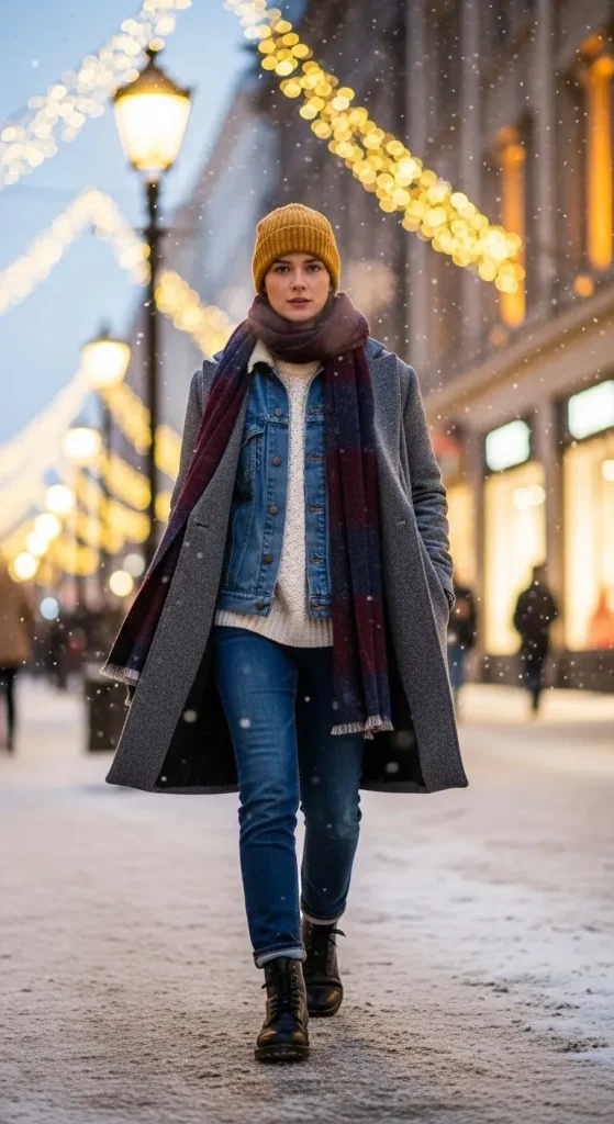 Layering a wool coat over a denim jacket is a great way to add texture and warmth. The denim jacket gives the outfit a casual vibe, while the wool coat elevates it to a more sophisticated level. You can go for a classic beige wool coat or pick a fun, colored one for some added flair. If you want to cut costs, try layering your favorite denim jacket over a basic sweater for warmth.