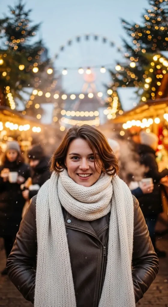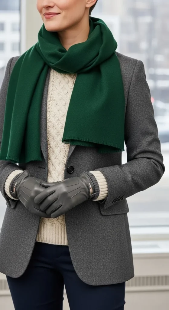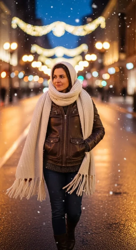 Layer a chunky scarf with a leather jacket for a bold, stylish combination. The scarf adds a soft texture that contrasts nicely with the edgy feel of the leather jacket. This outfit is great for a day out in the city or a casual holiday gathering. If you’re on a budget, try layering a secondhand leather jacket and pairing it with a homemade chunky scarf for a unique, personalized look.