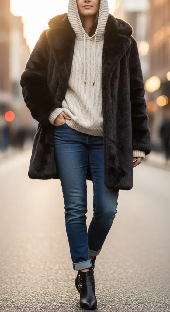 A hoodie under a faux fur coat is a great way to combine warmth with a luxurious feel. The hoodie provides comfort, while the faux fur coat adds glam. This combo is perfect for casual winter nights or a laid-back holiday party. If you’re on a budget, look for secondhand faux fur coats or upcycle an old hoodie by adding a fun patch or embellishment.