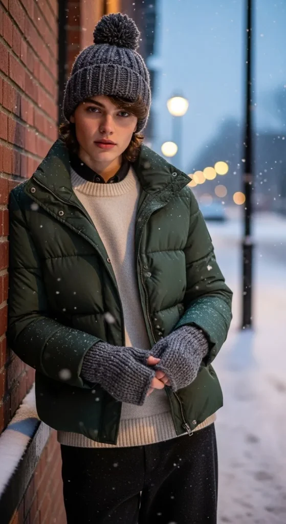 A puffer coat over a denim shirt combines the best of both worlds—practical warmth and casual style. This outfit is easy to wear for outdoor activities or casual gatherings. If you’re on a budget, search for secondhand puffer coats or denim shirts to make the look your own.
