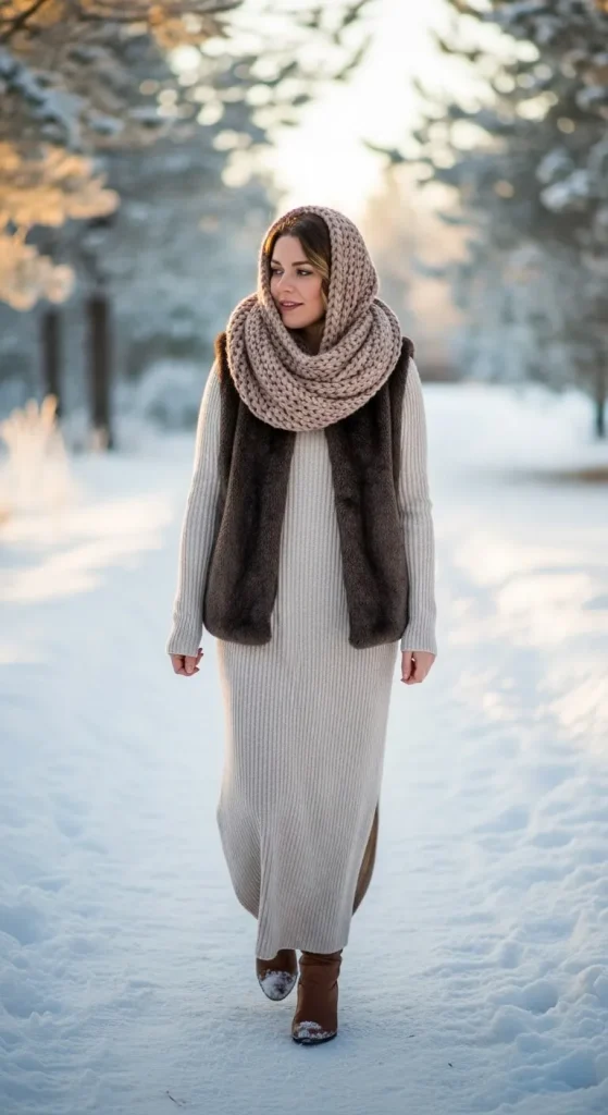 A knit dress layered with a faux fur vest combines comfort and luxury. The knit dress keeps things cozy, while the faux fur vest adds texture and warmth. This combo is perfect for holiday dinners or winter parties. Try a neutral knit dress and pair it with a contrasting faux fur vest for visual interest. If you’re looking to save, hunt for deals on faux fur at outlet stores or thrift shops.