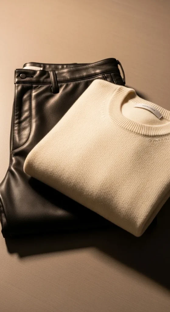 Leather pants make any outfit feel sharper. Pair them with soft knits for balance. Real leather isn’t required—faux-leather leggings or trousers look just as good. Add ankle boots or sneakers. For a low-cost fix, shine older faux-leather with a little baby oil on a cloth. Keep makeup simple to match the clean style.