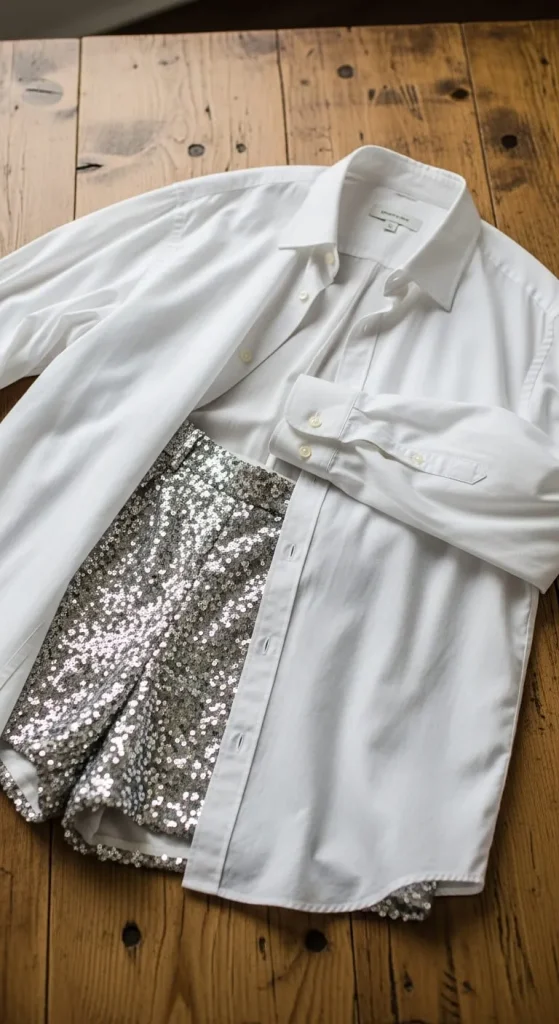 A crisp white shirt pairs well with sparkly skirts or shorts. The clean top balances the shine. Borrow a men’s shirt if you want a budget option. Tuck in one side or tie the bottom into a knot for shape. Add small earrings and a clutch. This look fits dinners, parties, and casual get-togethers.
