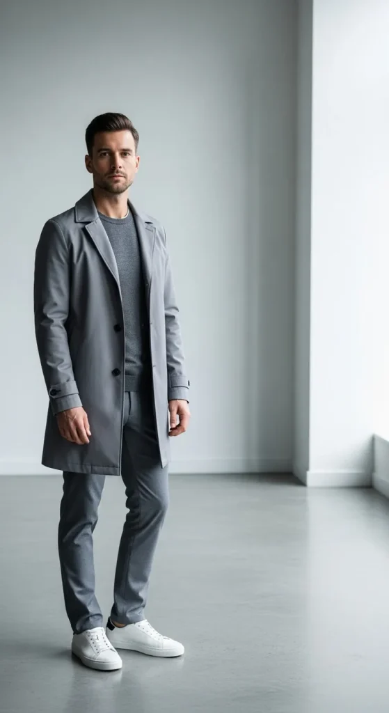 Grey-on-grey always looks intentional. Mix textures: a wool blazer, cotton shirt, and wool trousers. Keep accessories minimal and shoes simple. It’s modern and sleek without trying too hard.