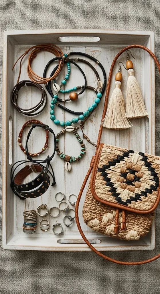Boho accessories often look like they’ve been gathered from different adventures. Add pieces that feel meaningful, handmade, or textured.