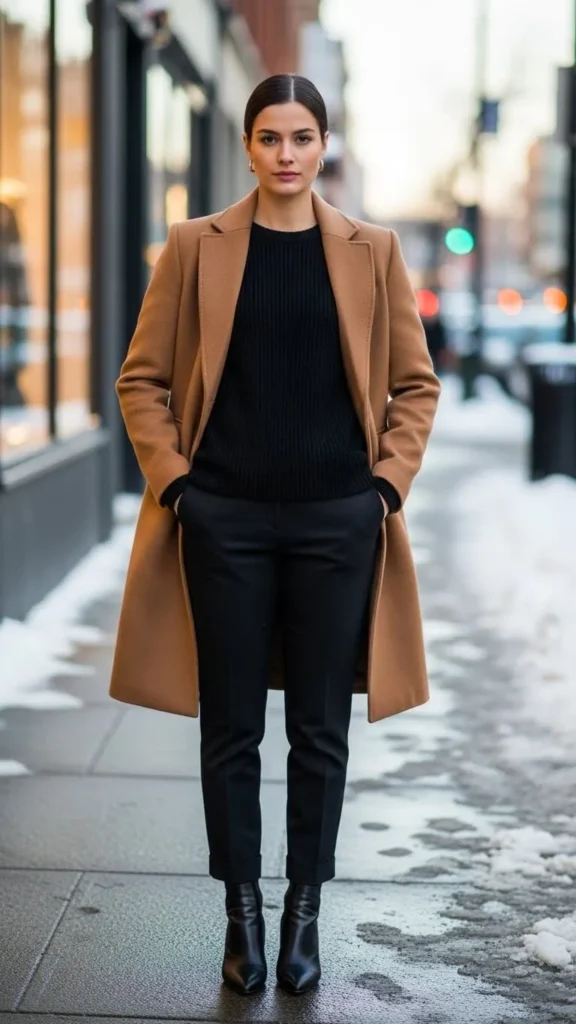 - A camel coat as the hero, with all-black underneath