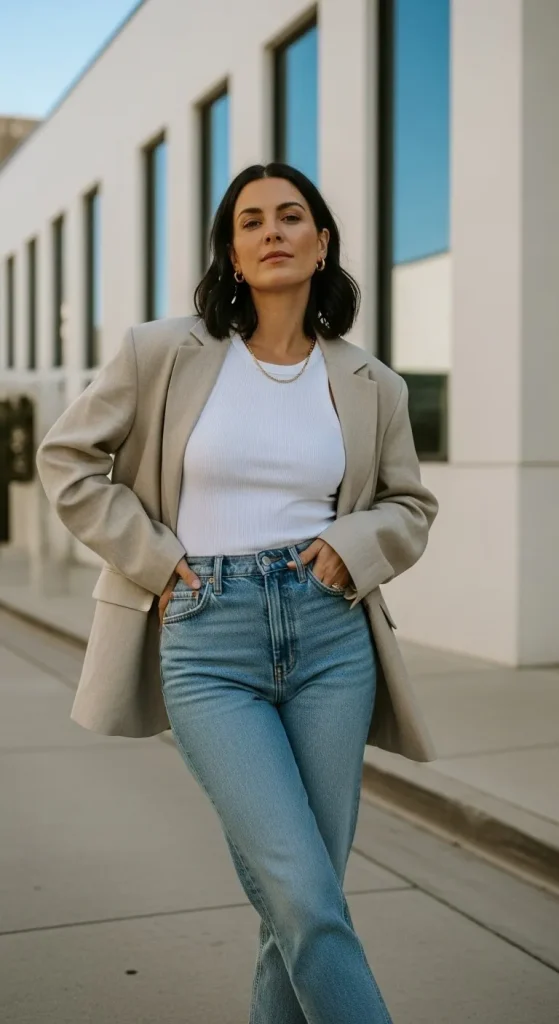 The key is to keep the base layer simple so the blazer + jeans combination stays the highlight.