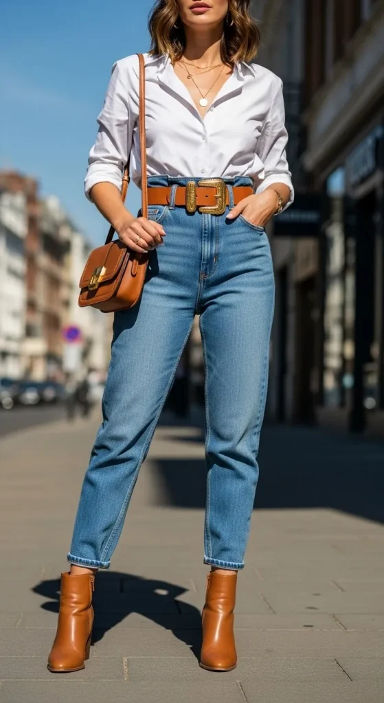 • High-waisted jeans: Pair with a wide belt to emphasize your waistline.
