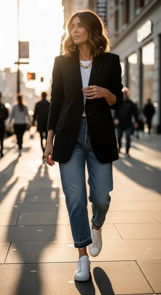 Boyfriend jeans don’t have to be casual. Add a blazer and suddenly your outfit looks polished without losing its relaxed edge.