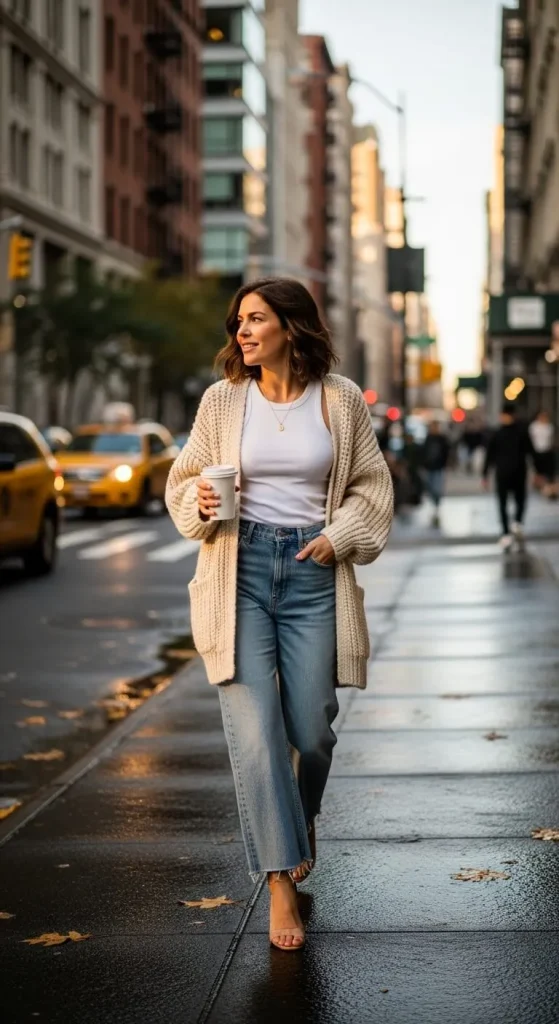 - Bold tones: Mustard yellow, forest green, or rust orange cardigans add life to minimalist outfits.