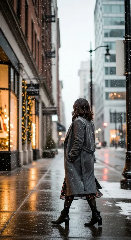 Keep layering minimal and let the dress be the hero piece. A belt can help define your shape without adding extra warmth.