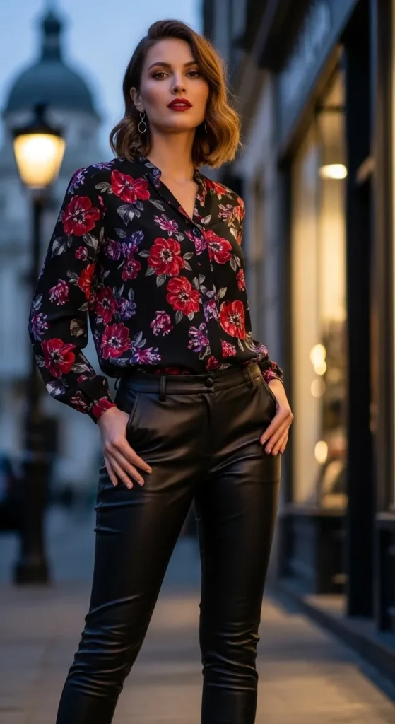 Muted floral prints also tend to look more sophisticated, pairing beautifully with neutral tones and even leather for a tough yet feminine look. For example, a dark floral blouse tucked into a pair of high-waisted trousers exudes a chic, professional vibe while still allowing you to enjoy the beauty of floral patterns.