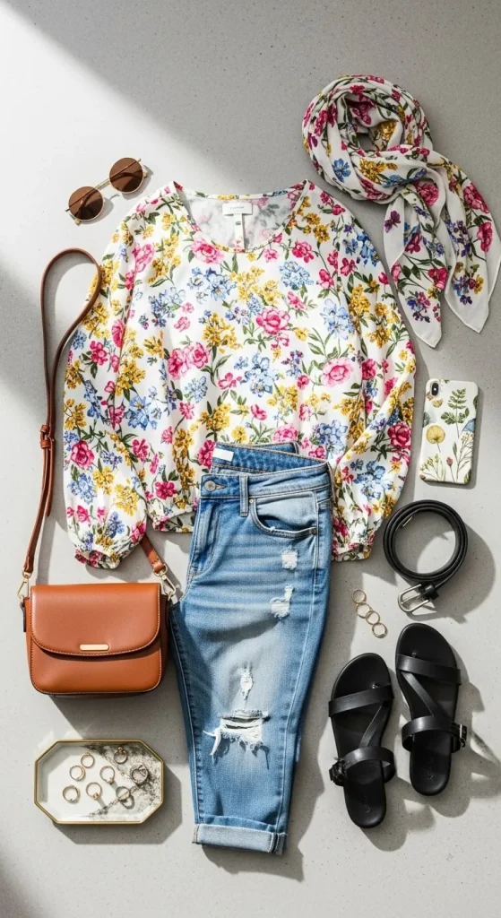 Try pairing a floral top with a denim jacket or denim jeans for an easy, everyday outfit that isn’t overly feminine. A floral dress layered under a leather jacket will also give you that tough-but-pretty aesthetic. If you’re wearing a floral scarf, it pairs beautifully with a denim vest or leather boots, creating a modern boho vibe that’s still sharp.