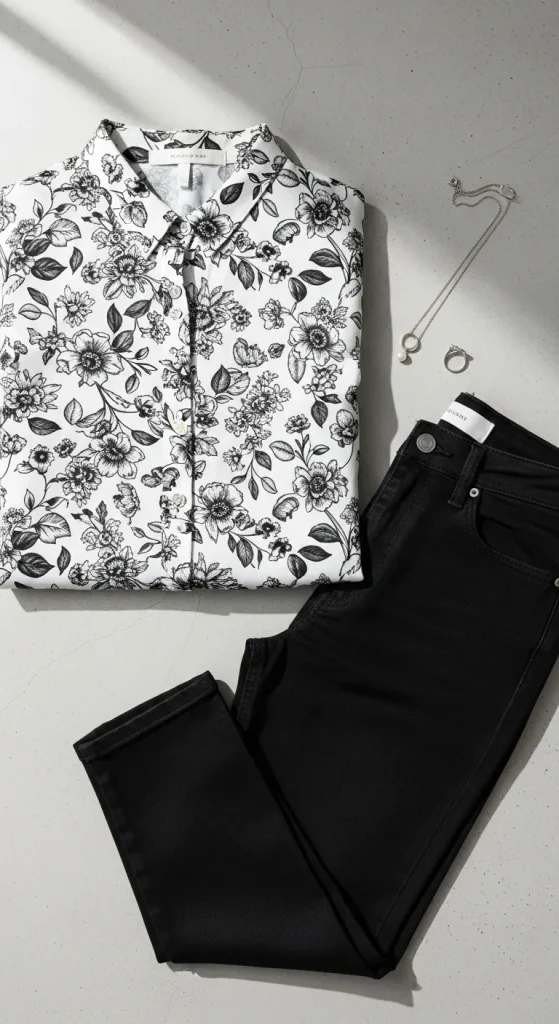 One way to do this is by choosing neutral floral prints that don’t feature too many colors. A black and white floral blouse can easily be paired with almost anything, and it gives off a more minimalist vibe while still incorporating floral elements. By sticking to neutral colors for the rest of your outfit, you allow the floral print to be the focal point.