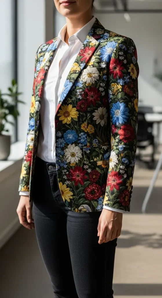 For example, a floral blazer or a floral pencil skirt will add structure to your outfit, making it look more professional and less playful. Structured floral prints add an element of sophistication that’s perfect for the office or a night out. Additionally, when choosing structured florals, go for clean lines and avoid too much frill or ruffles—this will help keep the outfit looking modern and minimalist.
