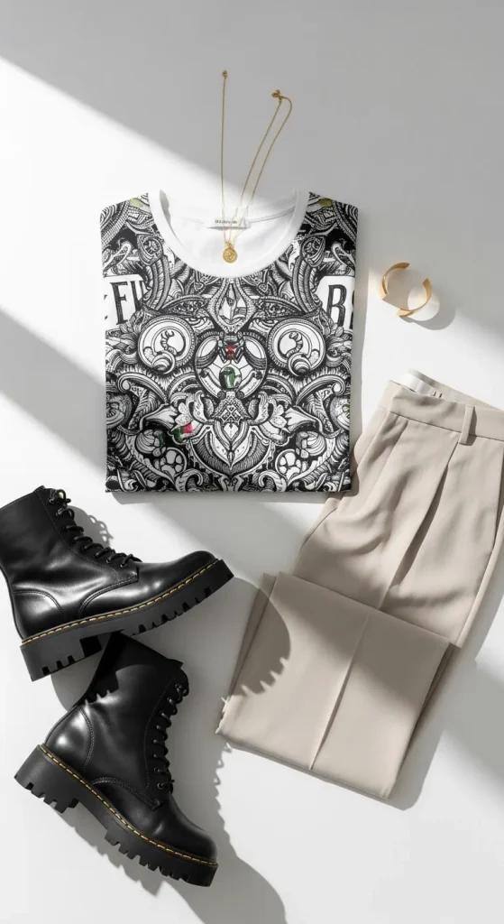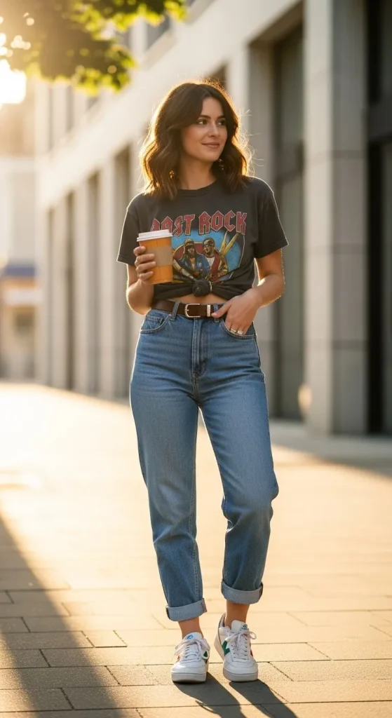 A few accessories help polish the outfit without losing the tee’s relaxed feel.