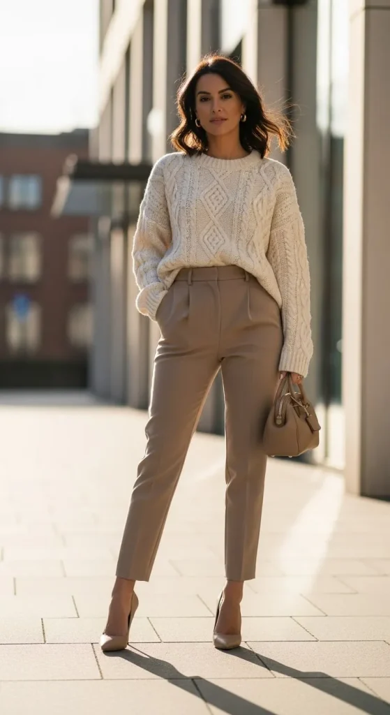 Imagine a cream wool coat layered over a silky cream blouse and tailored trousers — same colour, totally different feel.