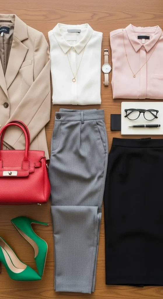 - For a softer touch, try pastel blouses under dark blazers or muted tones like dusty rose or sage.