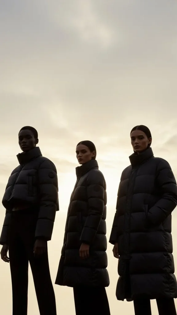 A high-quality photo of three puffer jacket silhouettes on models: cropped, mid-length, and long-line, against a clean outdoor background.