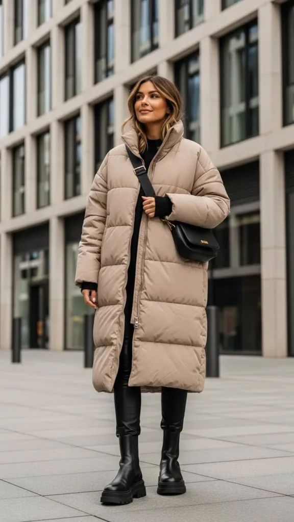 A Pinterest-style photo of a woman in a long beige puffer jacket paired with black faux-leather leggings and chunky Chelsea boots, standing by a modern city building.