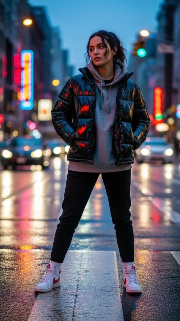 A young woman wearing a hoodie layered under a shiny black puffer jacket, paired with joggers and sneakers, standing on a city crosswalk.