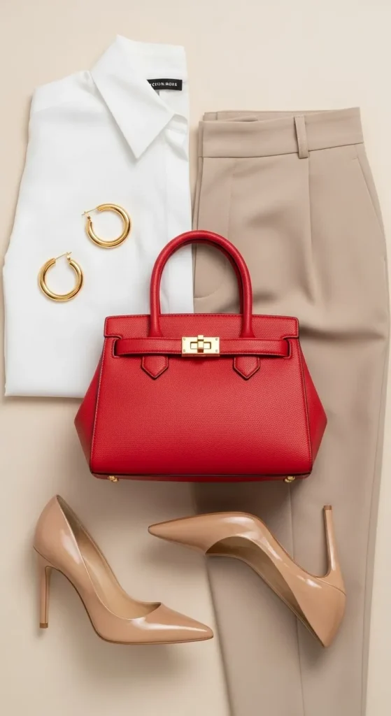 If your outfit is neutral (black, white, beige, grey), use a bright statement bag to create a powerful contrast.