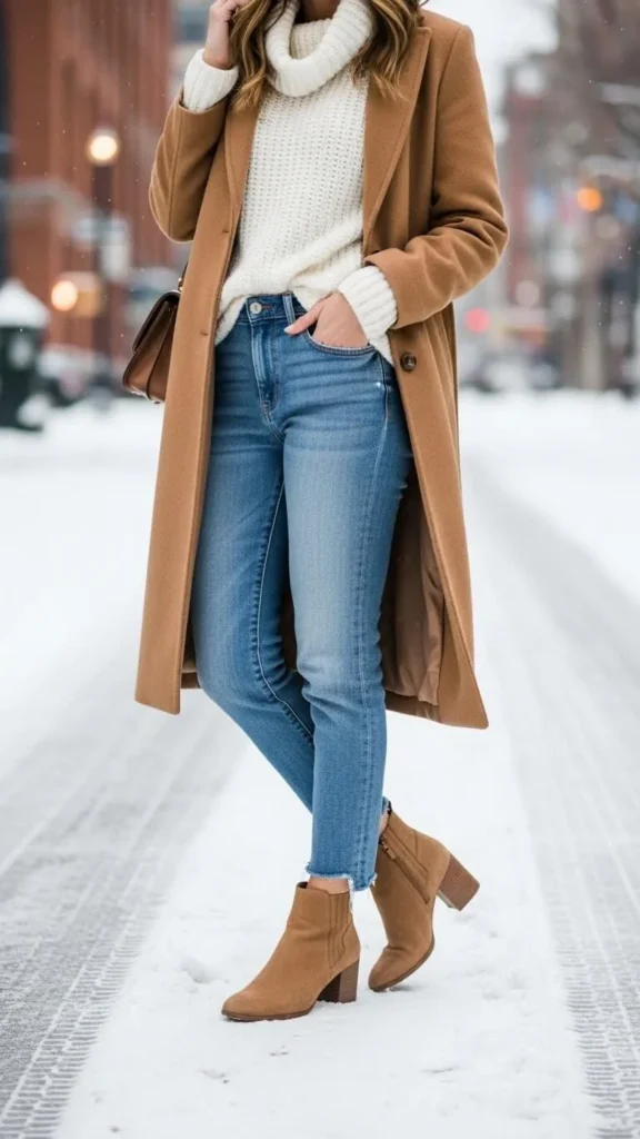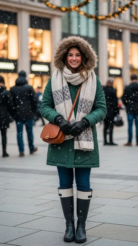Layering is what makes winter outfits both warm and stylish. The trick is to balance volume so the boots don’t feel too heavy.
