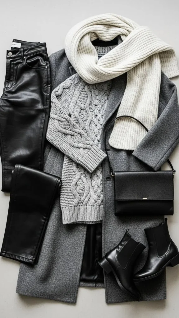 The contrast between soft, structured, and smooth textures makes the outfit feel intentional.