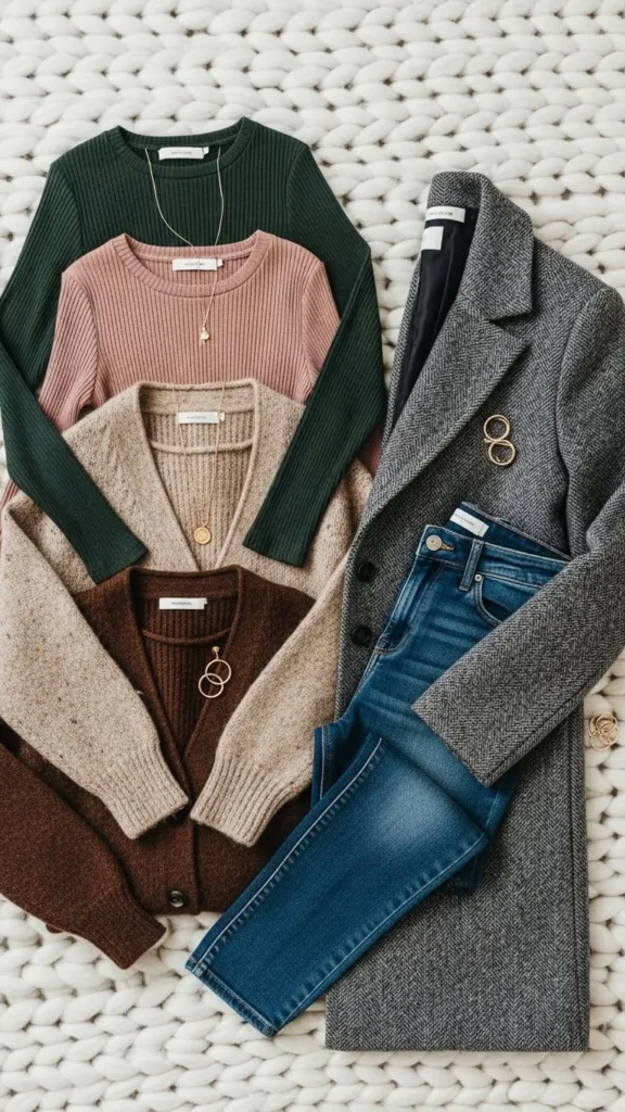 Start with a fitted base layer like a ribbed long-sleeve or thermal top. This keeps you warm while creating clean lines under sweaters and jackets. Add a soft mid-layer such as a cardigan or lightweight sweater, then finish with a structured coat that defines your shape.