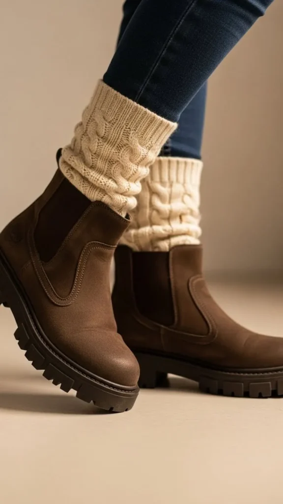 If your boots have a bit of space around the ankle, letting the top of your socks show gives a layered look that feels cozy and stylish.