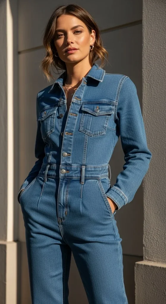 If mix-and-match feels overwhelming, jumpsuits are the cheat code. They’re one piece, effortlessly stylish, and instantly give the denim-on-denim vibe.